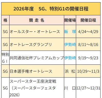 【オートレース】2026年度SG、特別G1の開催日程 2026年度 SG、特別G1の開催日程 格 競 走 名 開催場 開催日程 SG オールスター・オ... レース情報 2025/12/02 16:00