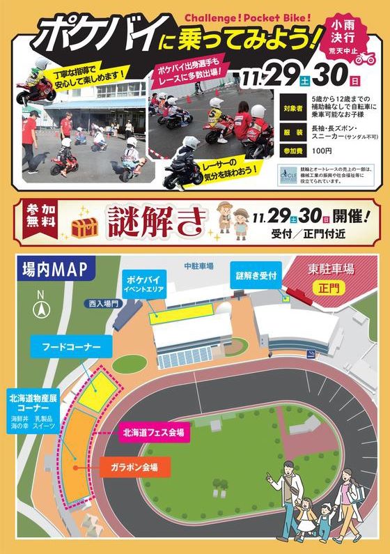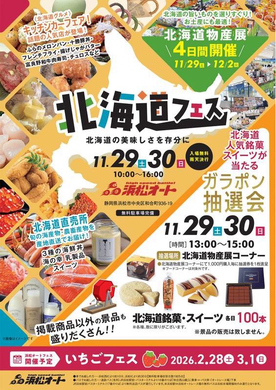 主なイベントは「北海道物産展」(全4日間、29日と30日は旬の海産物や農畜物産を産地直送で販売する「北海道旬鮮フェア」も)のほか、「子ども向けポケバイ教室」と「選手会カレンダーサイン会」(29、30日)、浜松オートレースヴィーナスのHONOKAさんによるトークショーと新走路観戦ツアー(30日)など。詳細は浜松オートのホームページで。