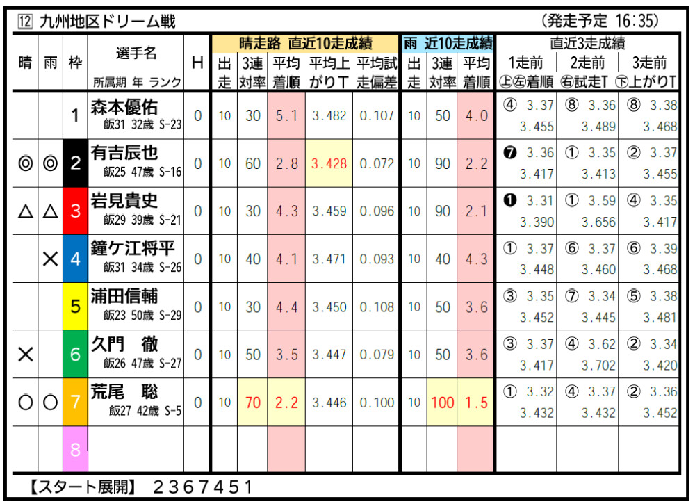 全場から九州出身者を集めて行う「さがけいば杯~九州地区選手権」が26日から始まる。29日までの4日制でデイ開催。地元S級は11人中10人が参戦。このうち、有吉辰也は前節の浜松GⅠで優出❼しての地元入り。岩見貴史は直前のミッドナイトを制してリズムは良好だ。エース荒尾聡は新品クランクを投入して気配一変を狙う。遠征勢は、山陽の丹村飛竜が唯一のS級として登場する。初日は12Rで「九州地区ドリーム」を実施。今節のランク上位7人の争いは、有吉辰也がトップSから逃げ切るとみて本命に推す。