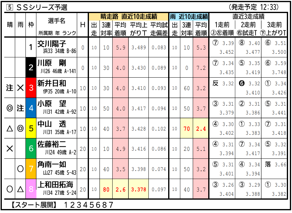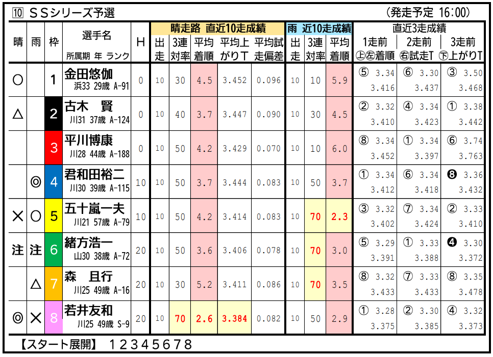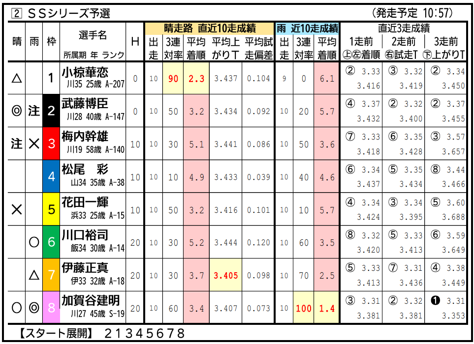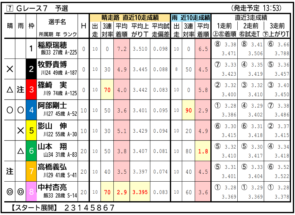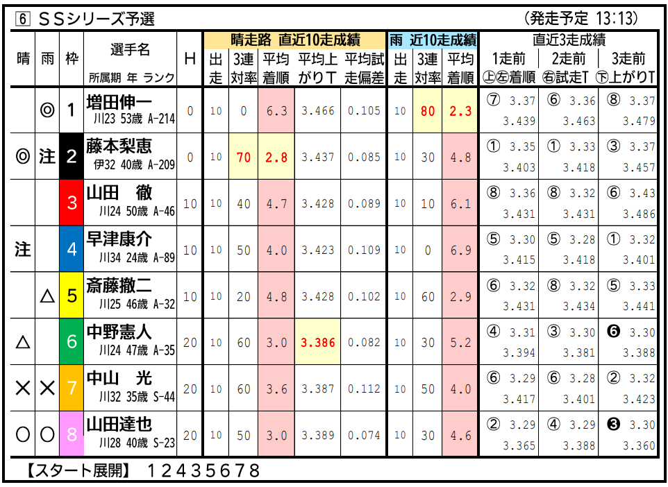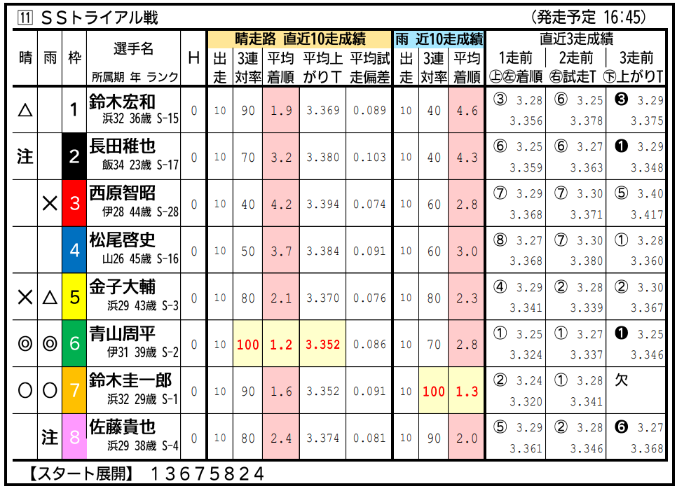 力量的に互角の圭一郎はエンジンの試行錯誤がまだ続いている。「実績のあるクランクに交換する」と大幅な整備に着手。吉と出れば逆転も可能だ。怖いのは最内の鈴木宏。徐々に本来のS力を取り戻しており警戒が必要。底力ある金子も軽視は禁物か。