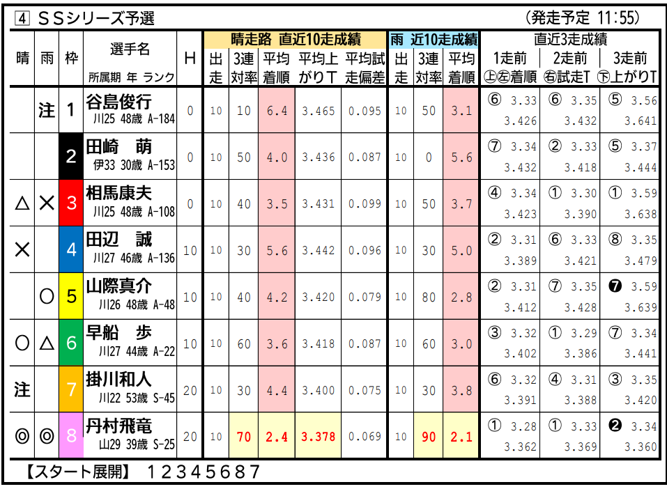 近況の動きなら丹村の追い上げが濃厚。相手探しに絞りたいが、2着争いは接戦。早船か相馬がその候補か。