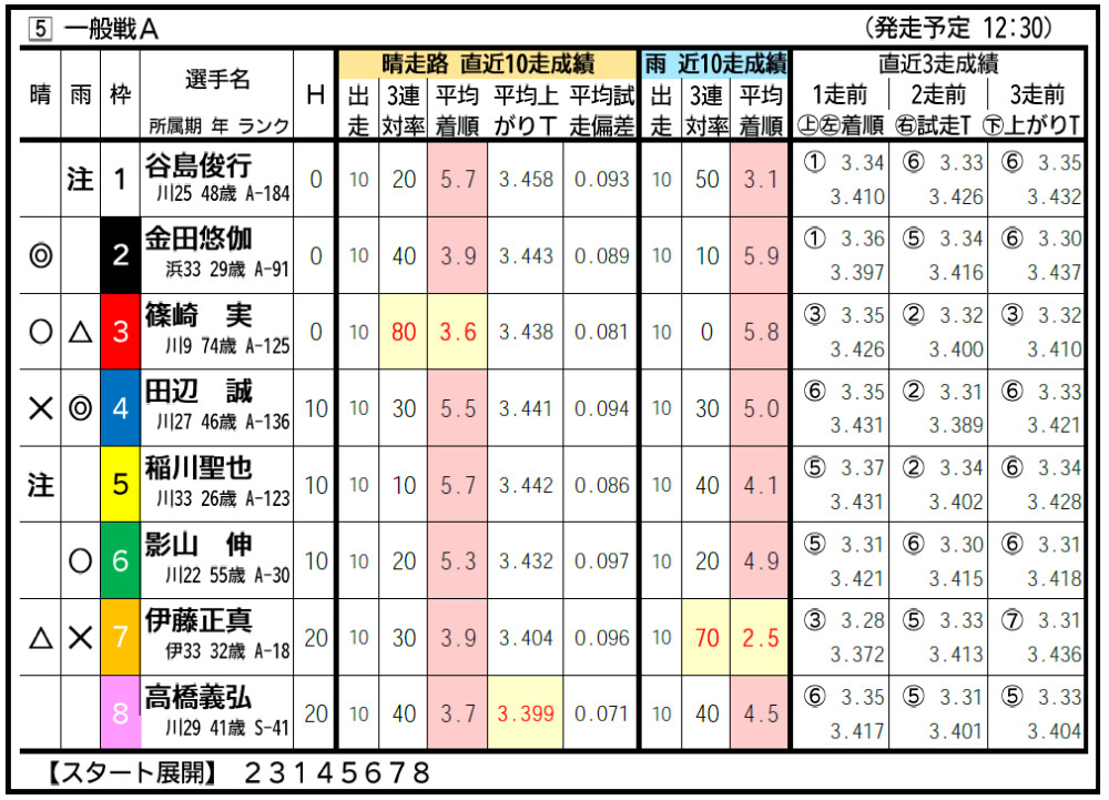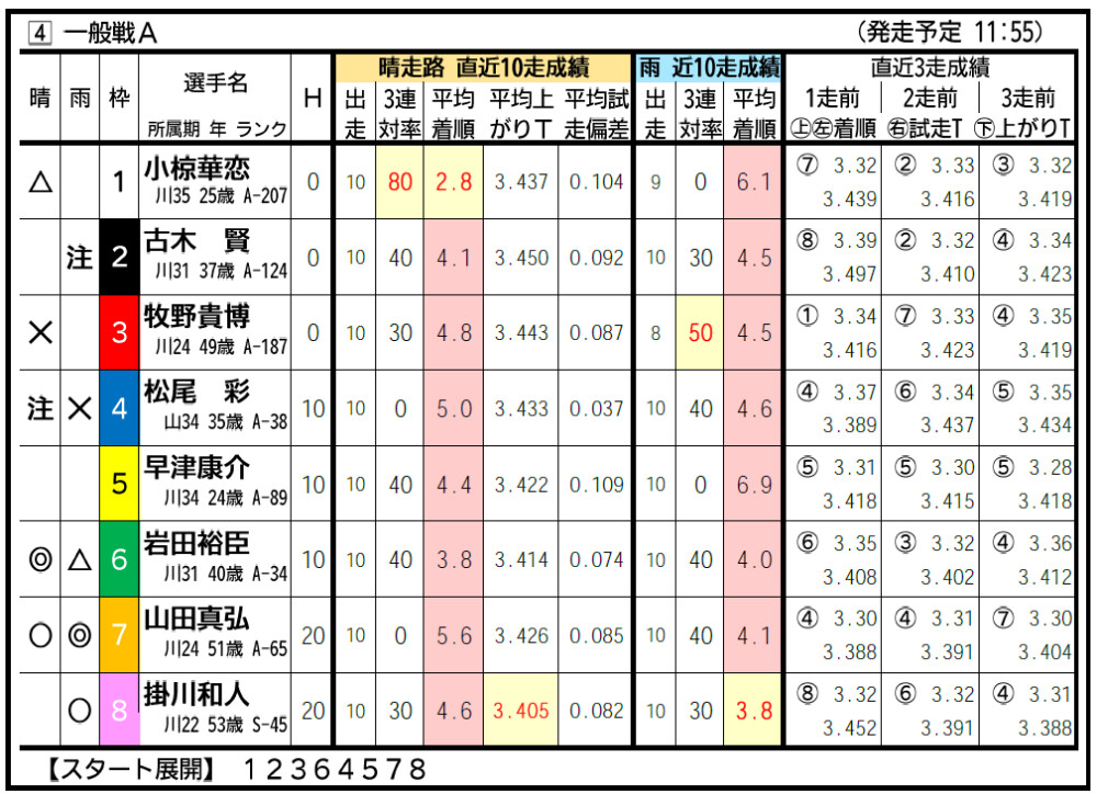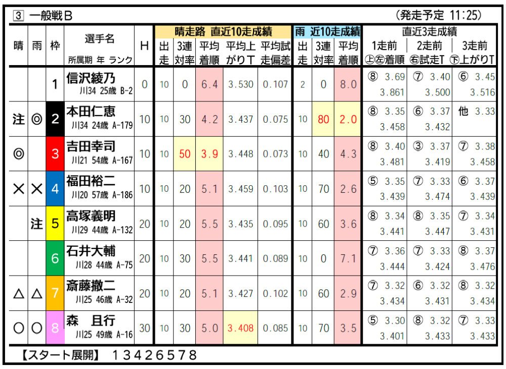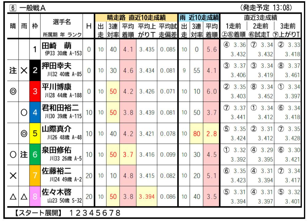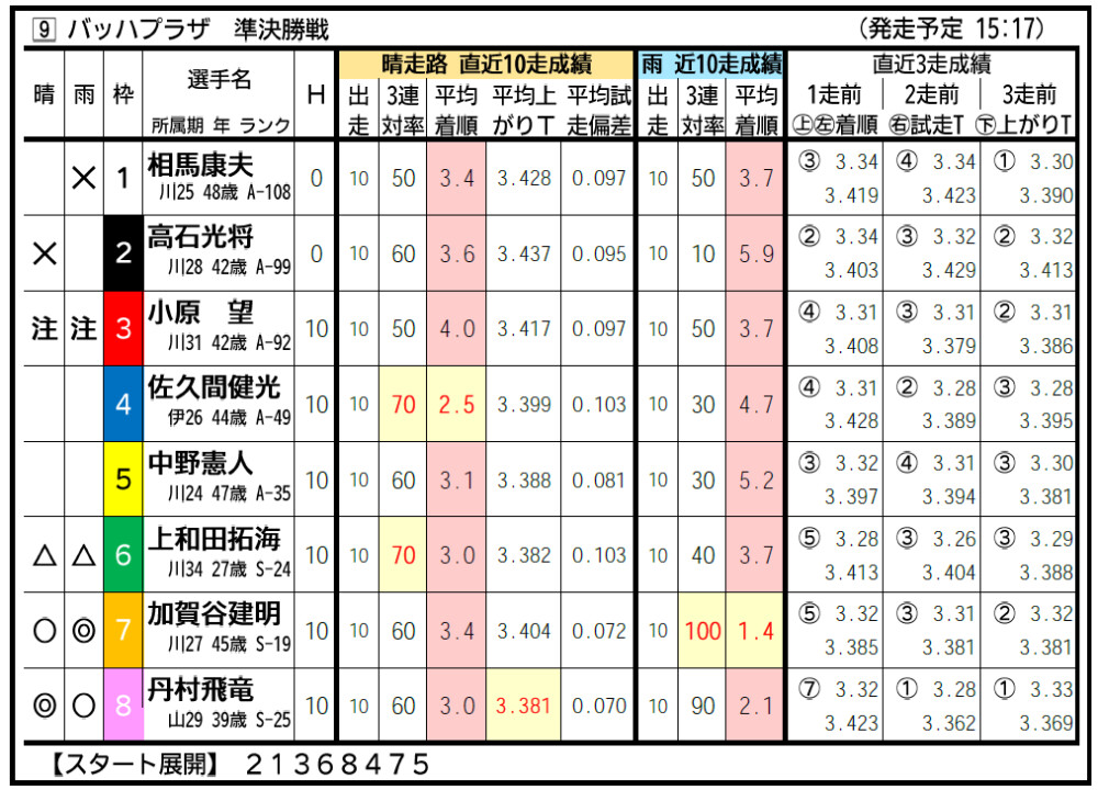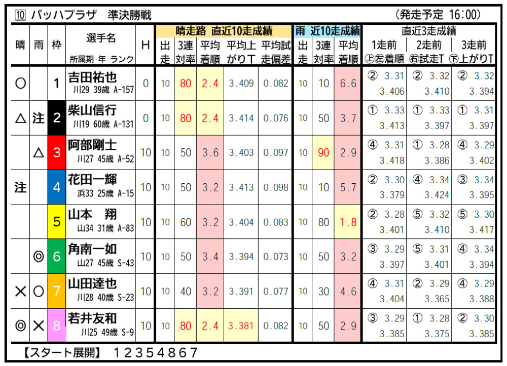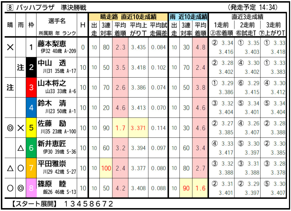 最重ハンディ両者は精彩を欠く動き。ならばはここは機力も悪くなさそうな平川から。逆転候補は泉田か。