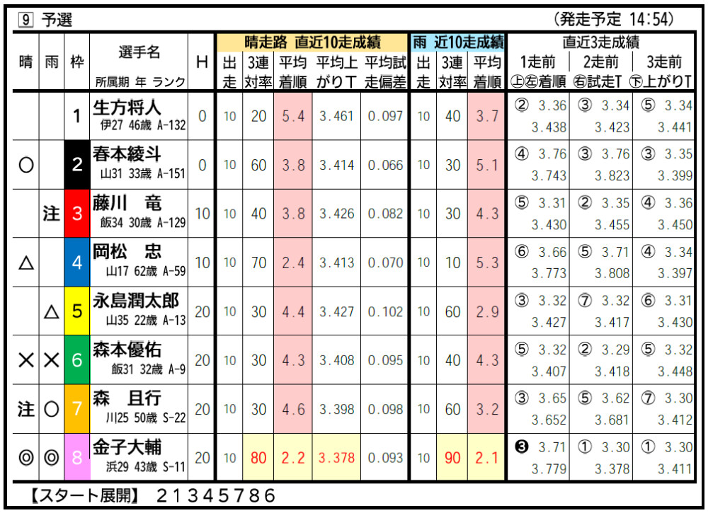 近況の好調度を考えれば金子の追いで十分。ハンディ的には春本の粘り込みが狙える。狙うなら森本の2、3着。