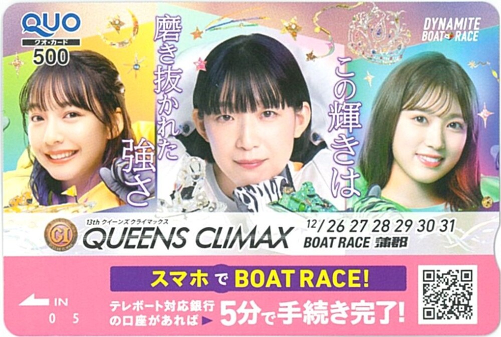 蒲郡ボートは、プレミアムGⅠ「第13回クイーンズクライマックス」の開催を記念して、オリジナルクオカード(500円分)=写真=を西スポレースサイトの読者10人にプレゼントする。希望者は、はがきに郵便番号、住所、氏名、年齢、電話番号と西スポレースサイトへの意見・要望を記入し、〒810-8721(住所不要)西スポレース部「プレミアムGⅠQCクオカ」係へ。西スポレース部のX(旧ツイッター、「西スポレース部」で検索)でも応募は可能(西スポレース部のアカウントをフォローし、当該記事をリポストすれば応募完了)。締め切りは、はがきは2025年1月7日必着、Xは同7日午後11時。