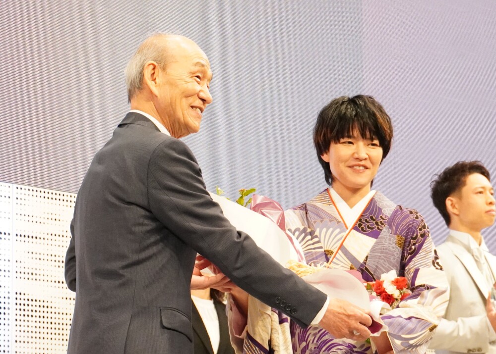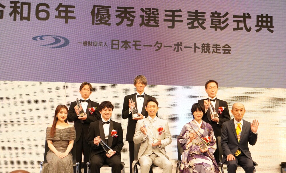 式典には花束のプレゼンターとして、ボートレースのCMに出演中の笹野高史さんと矢吹奈子さんが登壇。笹野さんは「持たせてもらったトロフィーはものすごく重たかった。この重さと同じような重い責任を(持って選手は走っているのだと)感じました。けがのないように1年間、ファンを楽しませてください。お気を付けて!」と無事を祈りながら表彰選手たちにエールを送った。
