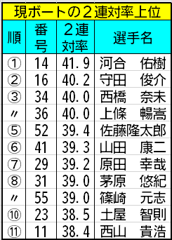そこで、現ボートの2連対率上位を表にしてみました。この表に挙がるボートは全て良艇と考えてください。