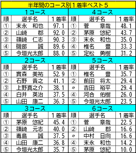 実力が拮抗するSGで好配当を狙うためには、やっぱりいろいろなデータを頭に入れておくことが肝要。そこで、今回は全選手のコース別1着率ベスト5(直近20節)を算出してみました。