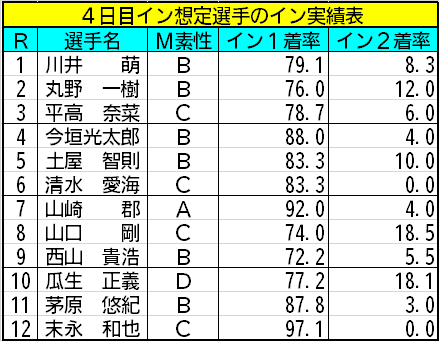 そこで、4日目番組の1号艇選手のイン実績表を見てみましょう。インの信頼度の目安は、イン1着率70%以上&エンジン素性Bランク以上ですが、この両条件を満たすレースが7つもあります。こうなると両条件を満たさない5つのレースの中から好配当を狙うしかありません。