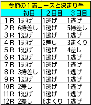 今節のここまで決まった逃げの本数は27本で、節間のイン1着率は75.0%。直近6カ月のまるがめのイン1着率は56.2%で、同じナイター場でも下関や大村とは違いインは大して強くないナイター場なのですが、今節はやはりSGとあってどうも毛色が違います。普段のまるがめとはかけ離れて考えた方が賢明かもしれません。