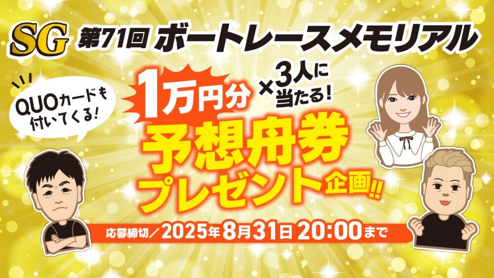 【プレゼント】若松ボートSGボートレースメモリアル 優勝戦の舟券1万円を3人に 特製クオカもセット