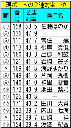 現ボートの2連対率上位ベスト15の表を見てください。エンジンは前節と打って変わって低調機シリーズですが、ボートも良艇は全てお蔵入りかというとそうではありません。