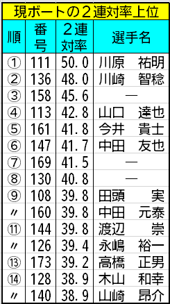 現ボートの2連対率上位ベスト15の表を見てください。近況は良機シリーズの場合がボートは低調艇シリーズ、低調機シリーズの場合は良艇シリーズという事が多かったのですが、今節は表を見ても分かるように良艇のほとんどが参戦しており良機良艇シリーズとなっています。