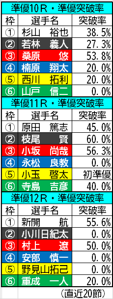 最も数値の高い選手が波乱の使者なのは言うまでもなく、10Rは桑原悠、11Rは枝尾賢が該当します。12Rも堅く収まりやすいとはいえ、村上遼は50.0%と新開に匹敵する数字を誇るので軽視は禁物でしょう。今まで一度も対戦しなかったA1がついにここで激突するだけに激戦は必至。今節の準優はどこも堅いとは言えないようです。