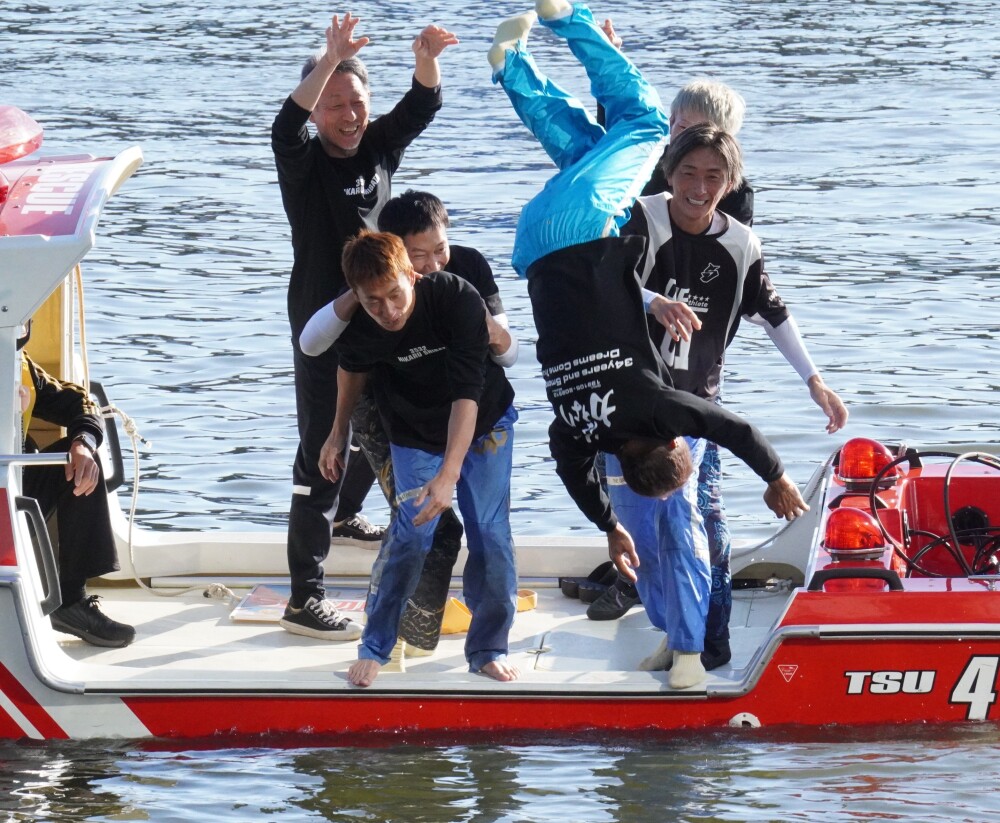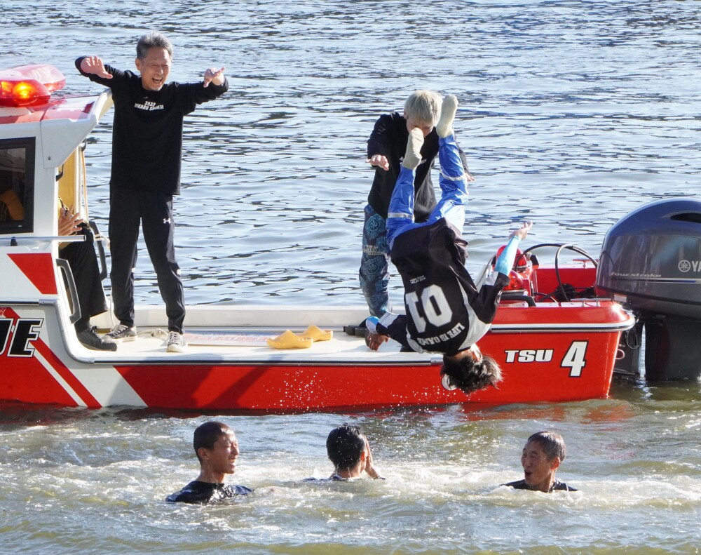 一緒に柴田を担ぎ上げてドボンと放り投げると、誰かに押されて峰も水面へドボン。柴田への祝福の拍手とともに、観衆はさらに沸いた。