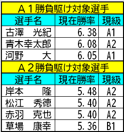 この表で言えば、A1勝負駆けの3人は古澤光紀は勝率を大きく下げなければいいのでほぼ当確。逆に青木幸太郎と河野大は白星ラッシュをした上で、ボーダーが下がるのを待たなければならず、かなり苦しい状況と言えます。