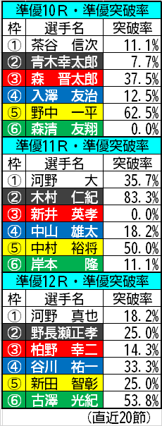 最も数値の高い選手が波乱の使者なのは言うまでもなく、10Rは野中一平、11Rは木村仁紀、12Rは古澤光紀が該当します。しかも、今回の準優1号艇トリオである河野真也、河野大、茶谷信次は直近10回の準優1号艇で、全員が10戦6勝と微妙な実績。今節の準優はどこも堅いとは言えないようです。