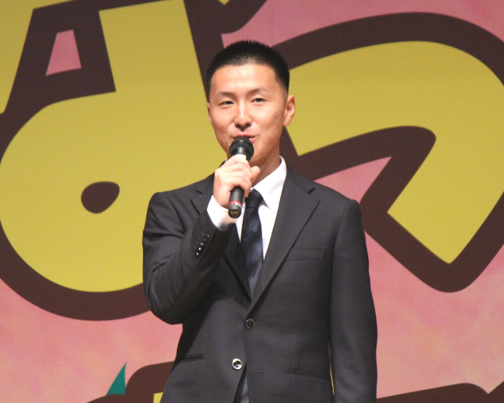 9日の若松ボートのイベントステージで、福岡支部に所属する137期新人選手、甲斐貴大(かい・たかひろ、23歳)と星田夢結(ほしだ・ゆい、20歳)の紹介があり、ファンに向けてあいさつした。