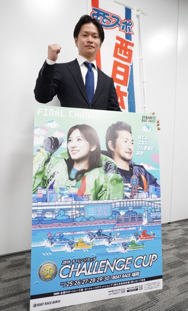 福岡ボート(福岡市中央区)で25日に並行して開幕するSG「第28回チャレンジカップ」とGⅡ「第12回レディースチャレンジカップ」(いずれも30日まで)のPR隊(福岡市経済観光文化局ボートレース事業部の山口慶広報宣伝係長ら)が14日、福岡市の西日本スポーツを訪れ、当地では初開催となる大会をアピールした。節間の売上目標額は130億円。
