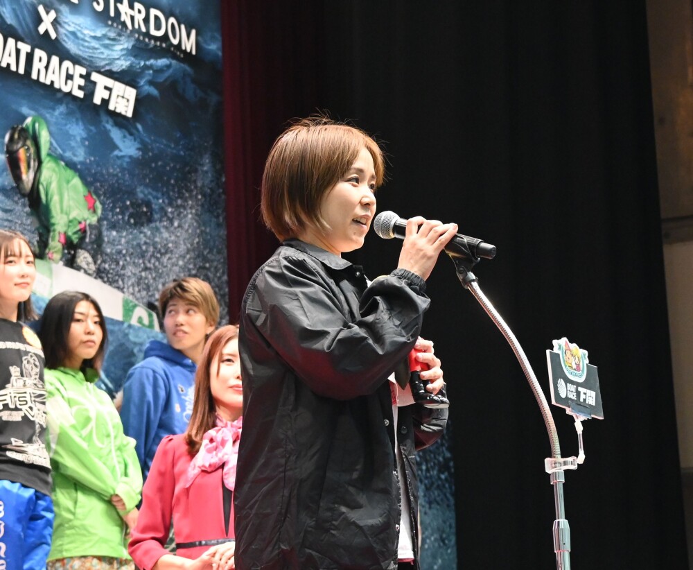 現在、下関ボートはプロレス団体の新日本プロレス並びにスターダムとコラボしていることを受け、大のプロレスファンとして知られる櫻本あゆみ(37)=群馬・101期・A2=は「新日本プロレスさんとコラボしている下関に来られてうれしいです。ボートレース下関で盛り上がれ!」と叫ぶと、会場は大盛り上がりとなった。