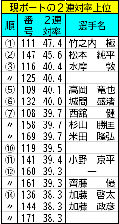 そこで、現ボートの2連対率上位を表にしてみました。近況、急激に成績を伸ばしていた119番が出場していないのは残念ですが、良艇のほとんどが登場しています。手にした選手の名前を見てみると機力が悪い選手は一人も見当たりません。良艇効果は水を吸って重くなるシリーズの後半になればなるほど大きくなるので、ここに名前が挙がるメンバーは最後まで注目しましょう。