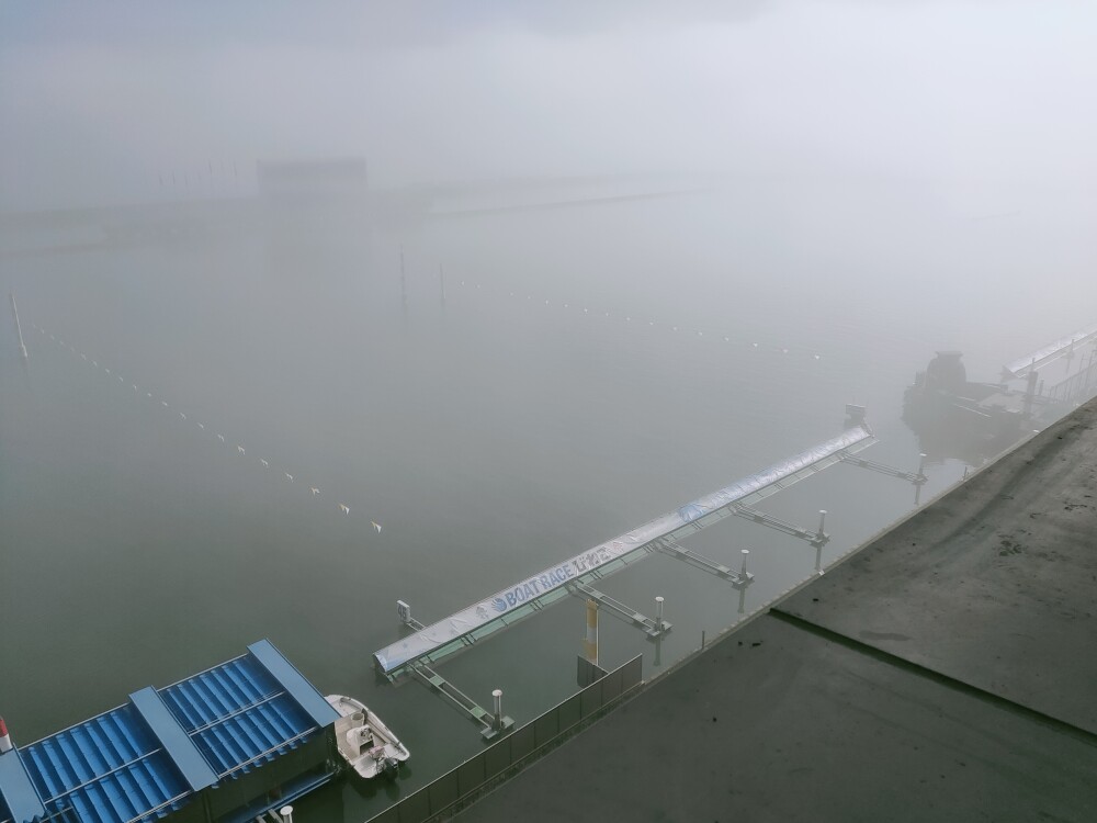 最初は風もなく、晴れない霧にやきもきするばかりだったが、緩~く風が吹き出すと、一気に晴れて視界回復。ずれ込んだレース進行もその後にじわじわと調整し、最終12Rの締め切り時刻は当初から16分遅れただけで、無事に一日を終えた。