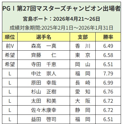 【ボートレース】PGⅠ第27回マスターズチャンピオン出場者【表】