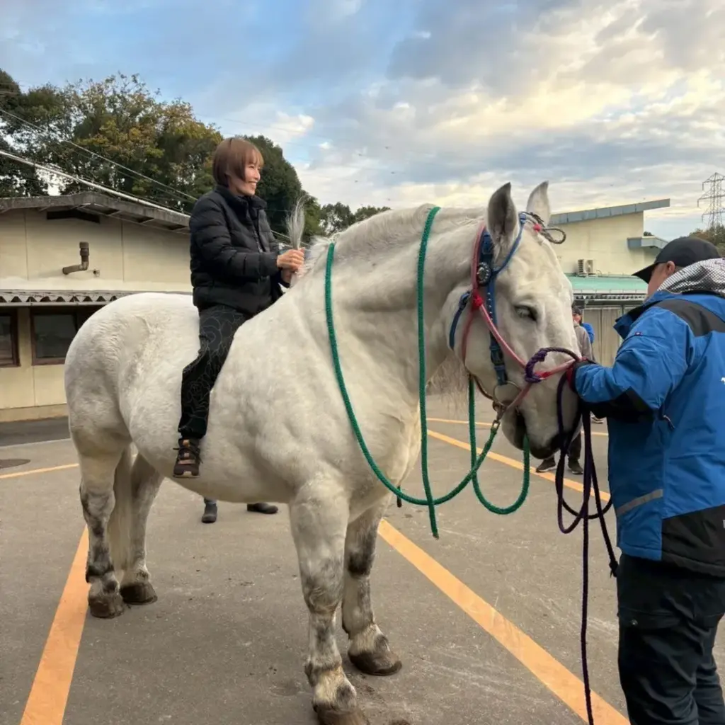 出場していた飯塚オート第69回GⅠ開設記念レース(11月20日~24日)で、11月24日「ばんえい十勝in飯塚オート」のイベントで来場していた〝ばん馬のハクウンリュー号〟に騎乗したショットを公開した。