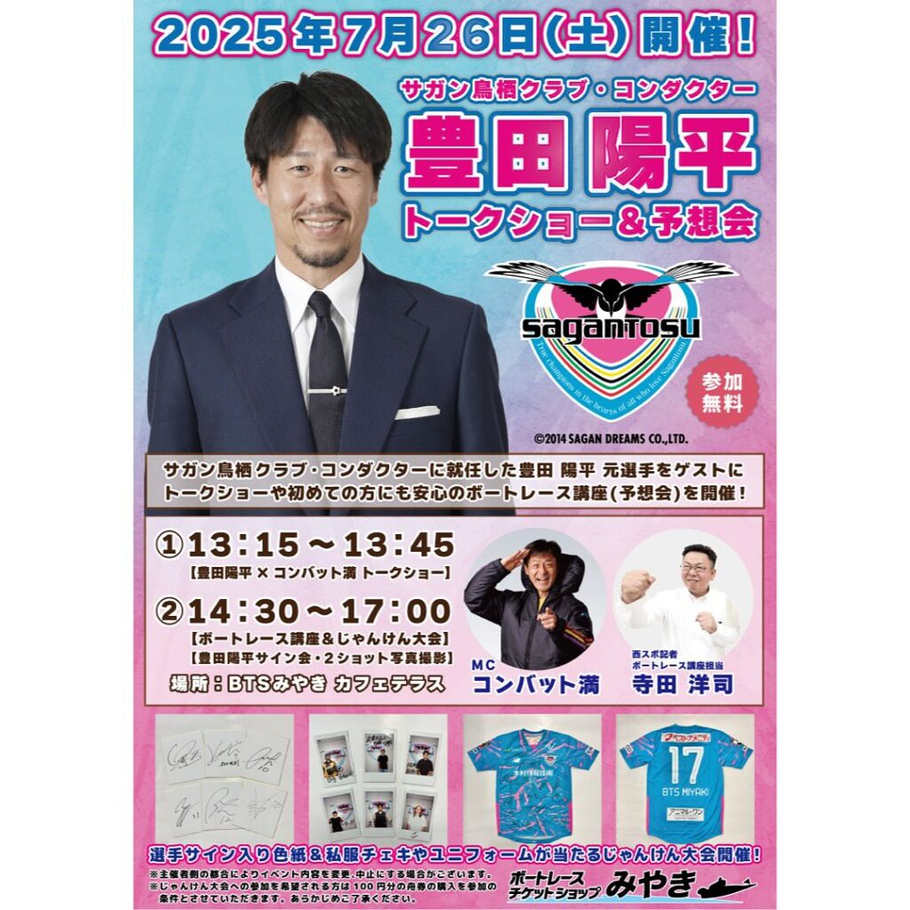「サガン鳥栖 公式X(旧Twitter)」、「ボートレースチケットショップみやき 公式インスタグラム」にて、現サガン鳥栖クラブ・コンダクターの豊田陽平氏が、7月26日(土) にトークショー、イベントを行ったと発表した。