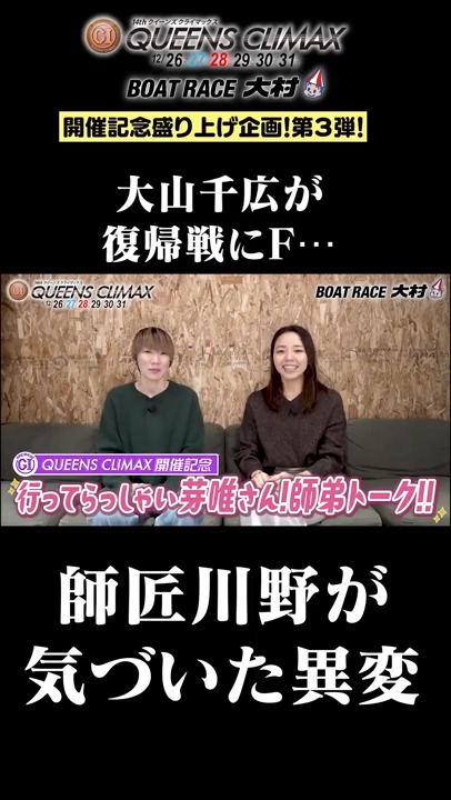 盛り上げ動画第3弾「行ってらっしゃい芽唯さん!師弟トーク」を公開 ボートレース大村の公式インスタグラムが、12月26日から開催する「PG1第14回QUEENS CLIMAX」の〝...