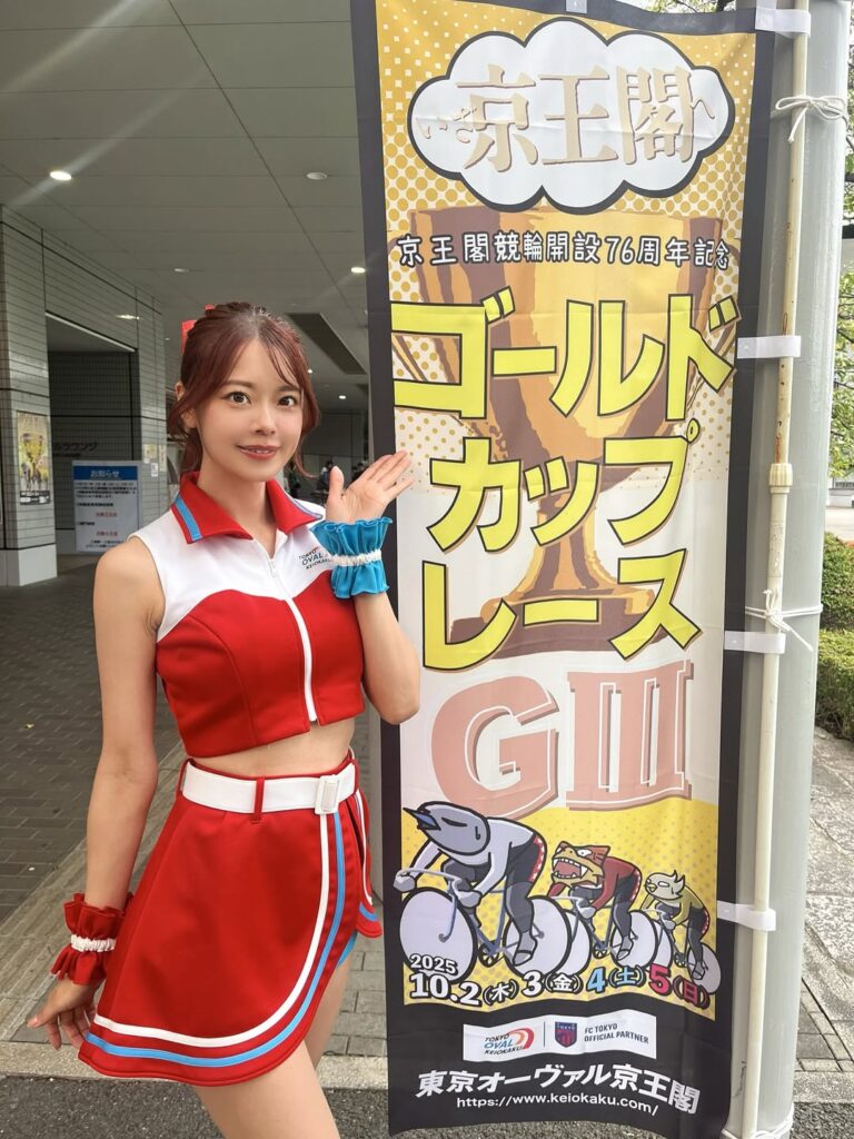 「綺麗でめちゃめちゃ可愛いですね」バンク内で旗振りをする〝京王閣競輪イメージガール〟が赤い〝ヘソ出し〟衣装で自転車を手に笑顔のショット