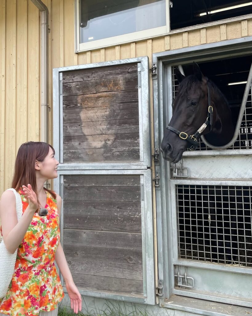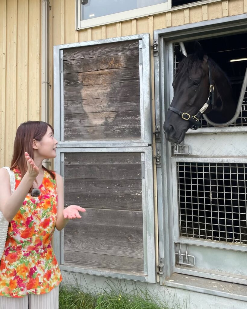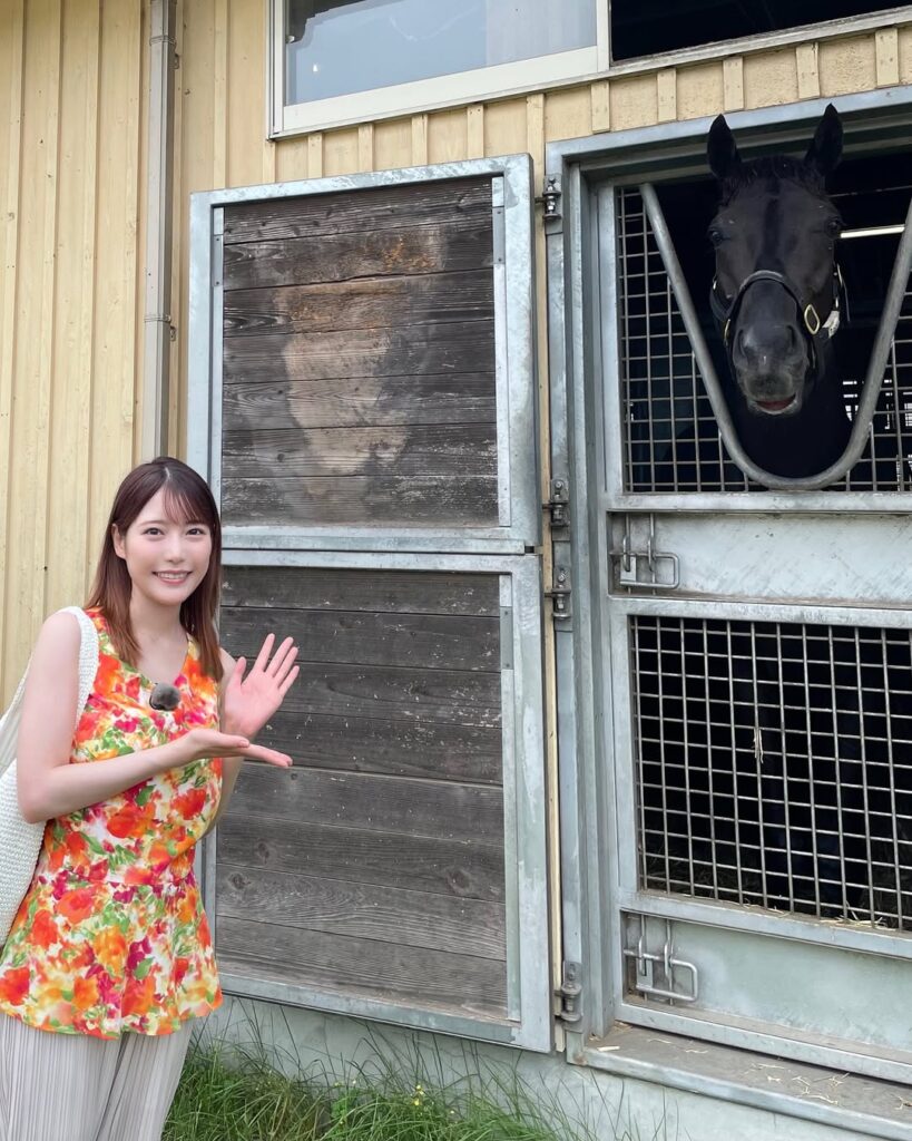 MCを務める『みんなのKEIBA』の取材で、滋賀県のノーザンファームしがらきを訪れた竹俣アナは、「今年のダービー馬クロワデュノールの夏休み中の様子を取材させていただきました!いっしょに写真を撮るとき、『あっち(カメラ)向いてくれる?』と言ったら、すっとカメラの方を向いてくれて、カメラ目線。賢くてかわいくてかっこいいクロワデュノールでした」と、競馬愛にあふれるコメントをつづった。