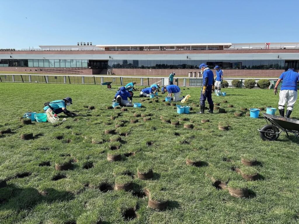 くり抜いた穴には、馬場内の芝養生地で育てた新しい芝を埋め込んでいきます🟢