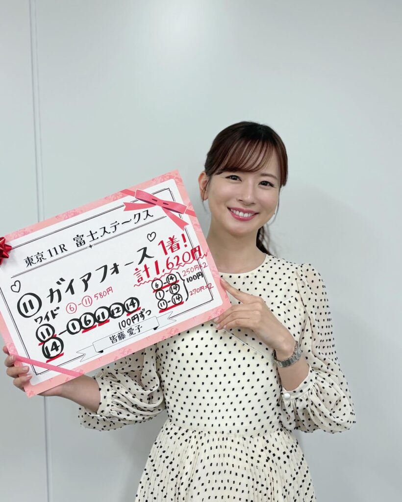 フリーアナウンサーの皆藤愛子さんが、10月18日東京競馬11R「富士ステークス」の〝予想的中〟と「ガイアフォース(牡6・3番人気)が3年ぶりの勝利」の喜びをインスタグラムにアップした。