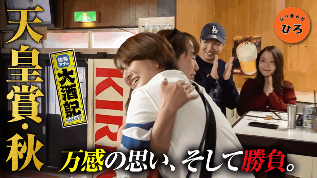東京競馬場の芝2000メートルに14頭中GⅠ馬が7頭という豪華メンバーが集結した秋の天皇賞。今年の負けが20万円を突破してしまった佐藤アナは、流れを変えるべく福岡ボート前の聖地・立ち飲み屋「酒処ひろ」を勝負の場に選ぶ。