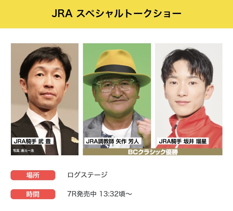 このトークショーの出演者は、投稿本文で紹介された坂井瑠星騎手(28)=栗東・矢作厩舎=に加え、レジェンドジョッキーの武豊騎手(56)=栗東・フリー=と矢作芳人調教師=栗東=の3人。