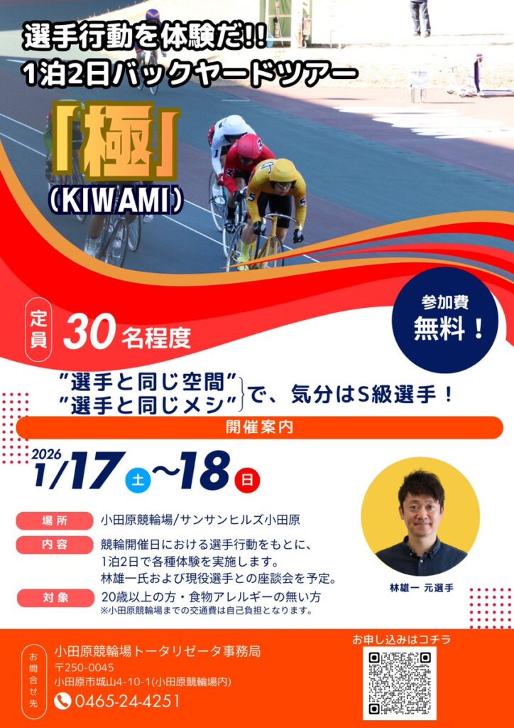 小田原競輪の公式Xが、2026年1月17日(土)~18日(日)の日程で1泊2日バックヤードツアー「極(KIWAMI)」を案内した。