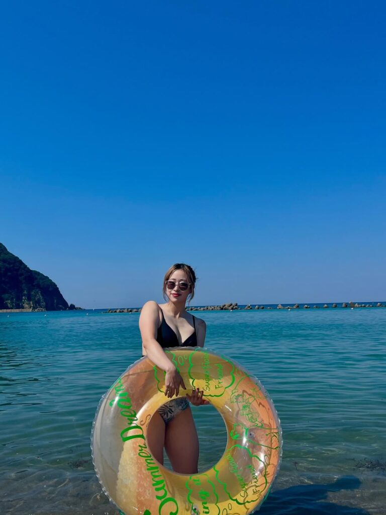 「身体バキバキ筋肉妹と、ウニ見つけて「いくらいっぱいおる!」言う従姉妹と、日焼け止め3種類3度塗りするワタシで、夏感じてきた!」とレアな〝水着姿〟のオフショット写真を公開した。