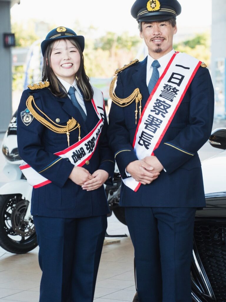 本日は一日署長を務めさせて頂きました」と、弟子の伊藤と制服姿の2ショットを公開した。