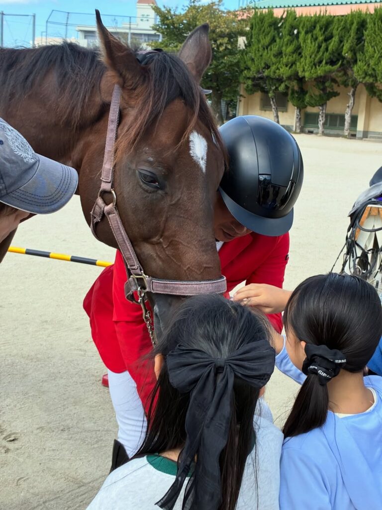 「実際にお馬さんの演技を見たり、お馬さんと触れ合ったりする体験では、馬の大きさにびっくりすることもありましたが、かわいいと優しくなでてくれるお子さんもたくさんいました」と、体験型の授業を行った。