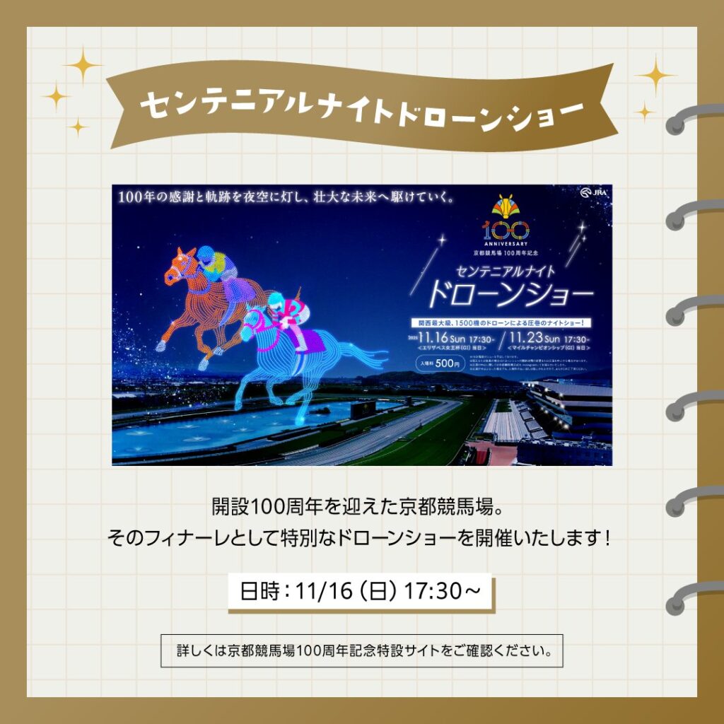 京都競馬場の公式Xが、 11月16日(日)・23日(日祝)の2日間限定で100周年を記念した「センテニアルナイトドローンショー」の特別開催を告知した。