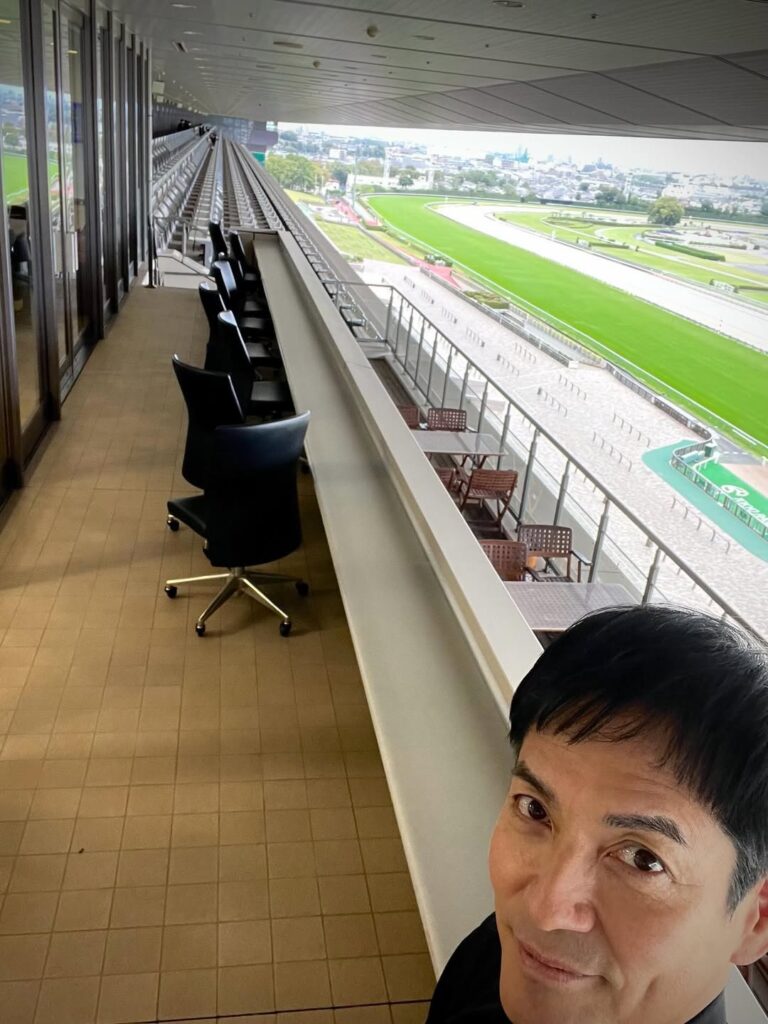 この投稿に「ドラマでのクールな馬主役が素敵です」「観客席独り占め、最高」「鮮やかな緑が見渡せる絶景ですね」などのコメントが寄せられた。