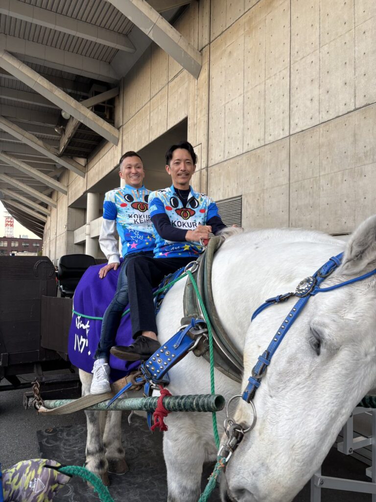 ボートレーサーの西山貴浩選手と森高一真選手がトークショーの終わりにハクウンリューに会いに来てくださいました」。と、2人仲良く笑顔で〝ばん馬〟のハクウンリューにまたがるショットを公開した。