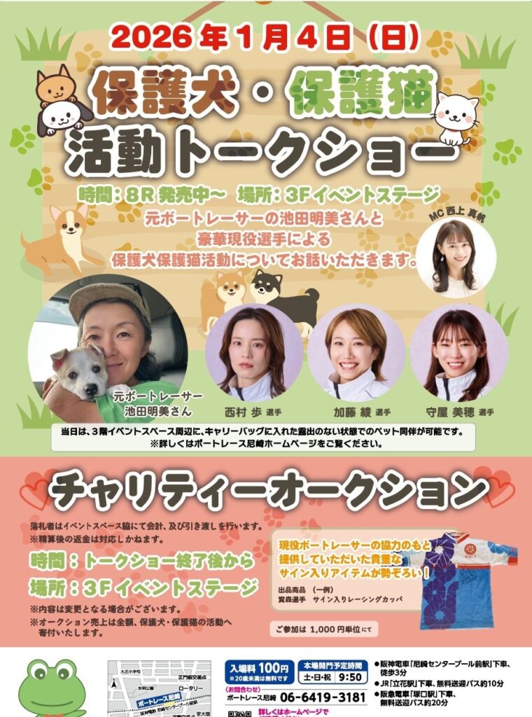 ボートレース尼崎の公式インスタグラムが、2026年1月4日「池田明美さんと豪華現役選手による保護犬・保護猫活動トークショーとチャリティーオークション」の開催告知をした。