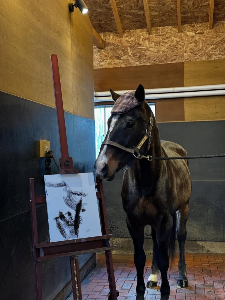 しかも左馬っぽいという縁起の良さ」と、ベレー帽をかぶり筆を口に咥えたワンダーアキュートが〝書き初め〟に挑戦。できあがった作品は、縁起がよいとされる〝左馬〟に見える。