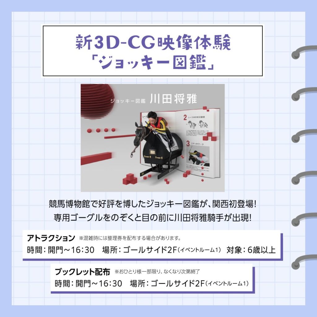 今週(1月10日~12日)は、競馬の世界をもっと身近に感じられる3D-CG映像体験「ジョッキー図鑑」や、Welcomeチャンス!特別版、さらにキミとアイドルプリキュア♪ショーを開催。