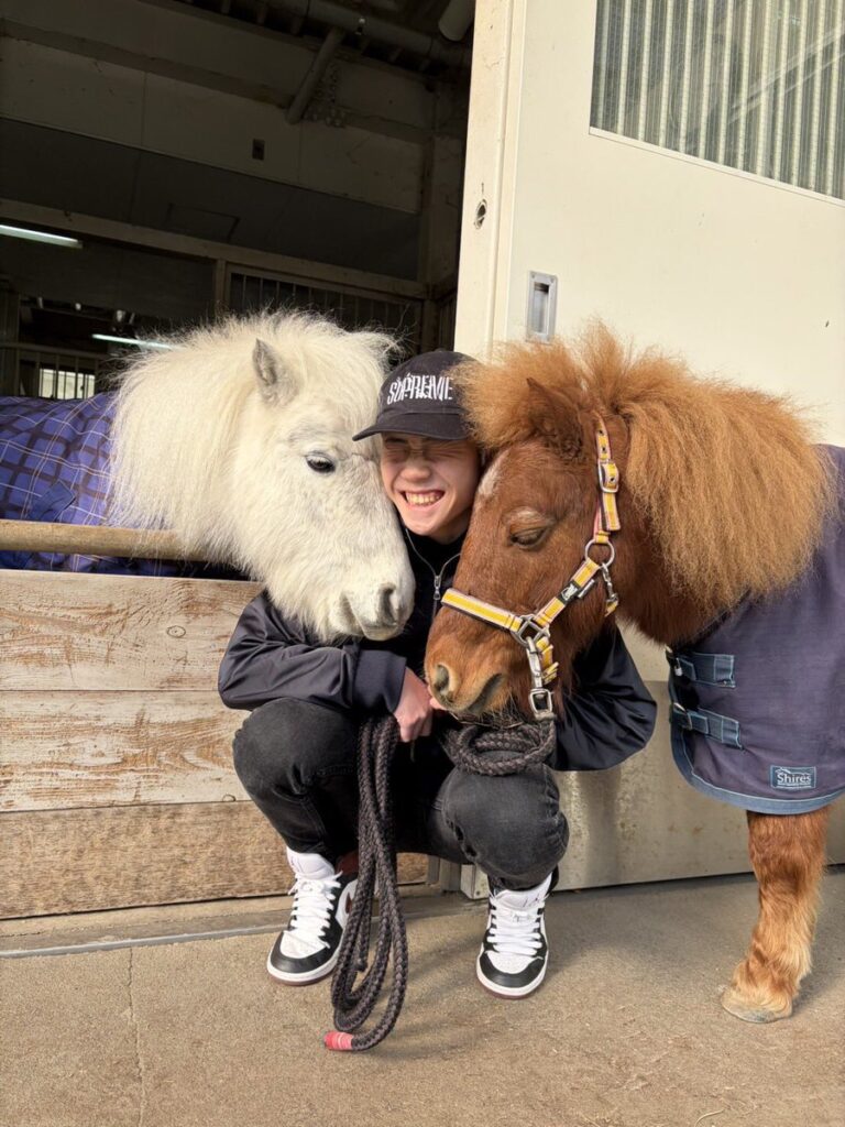 「もこもこな冬毛の2頭に挟まれて遠藤騎手もにこにこです」 JRA福島競馬場に遠藤汰月騎手が来場しミニチュアホースたちとの〝ふれあいショット〟を公開