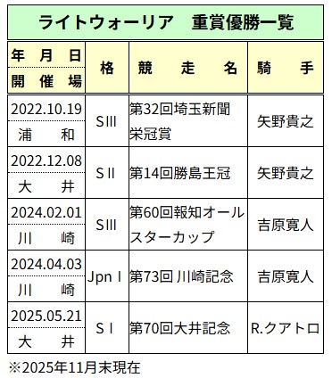 【競馬】2024年の年度代表馬ライトウォーリアが引退 神奈川県川崎競馬組合は3日、NARグランプリ2024の年度代表馬に選出されるなど数々の実績を残したライトウォーリア(牡8、内田勝義厩舎)の引退を発表した。同日に大井競馬で行われる「第17回勝島王冠」が... レース情報 2025/12/03 16:00