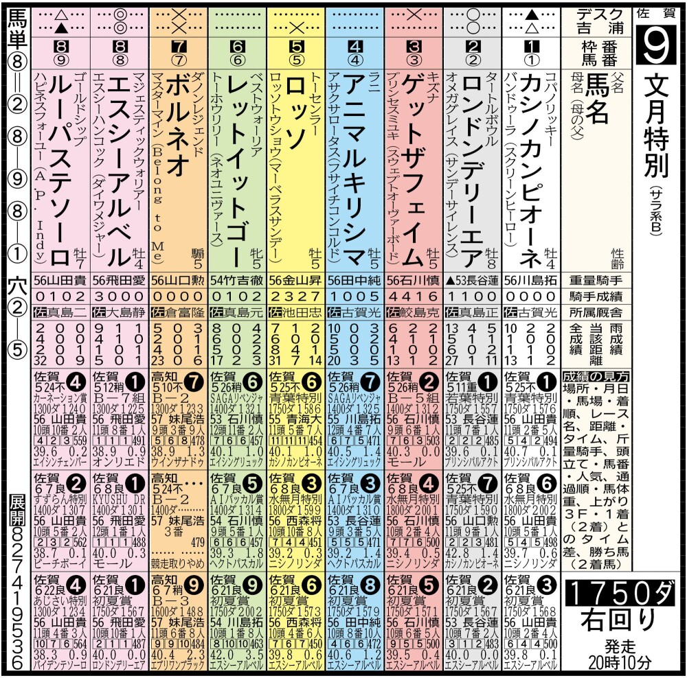 カシノカンピオーネは展開ハマれば突き抜ける力量を持つ。このほか、追い込み一手ながら末脚鋭いロッソ、高知B級から転入したボルネオにも注意。