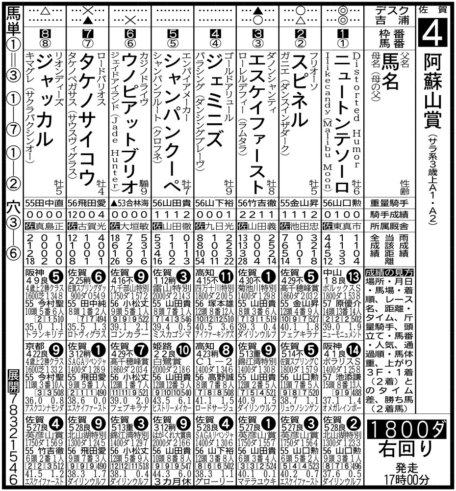 ▲タケノサイコウ・古賀師 ひと息入れた後の2戦目で前走より良いでしょう。ゲートが上手だし、そこそこ前へ行けるでしょう。1800mだから中団あたりになっても問題ない。