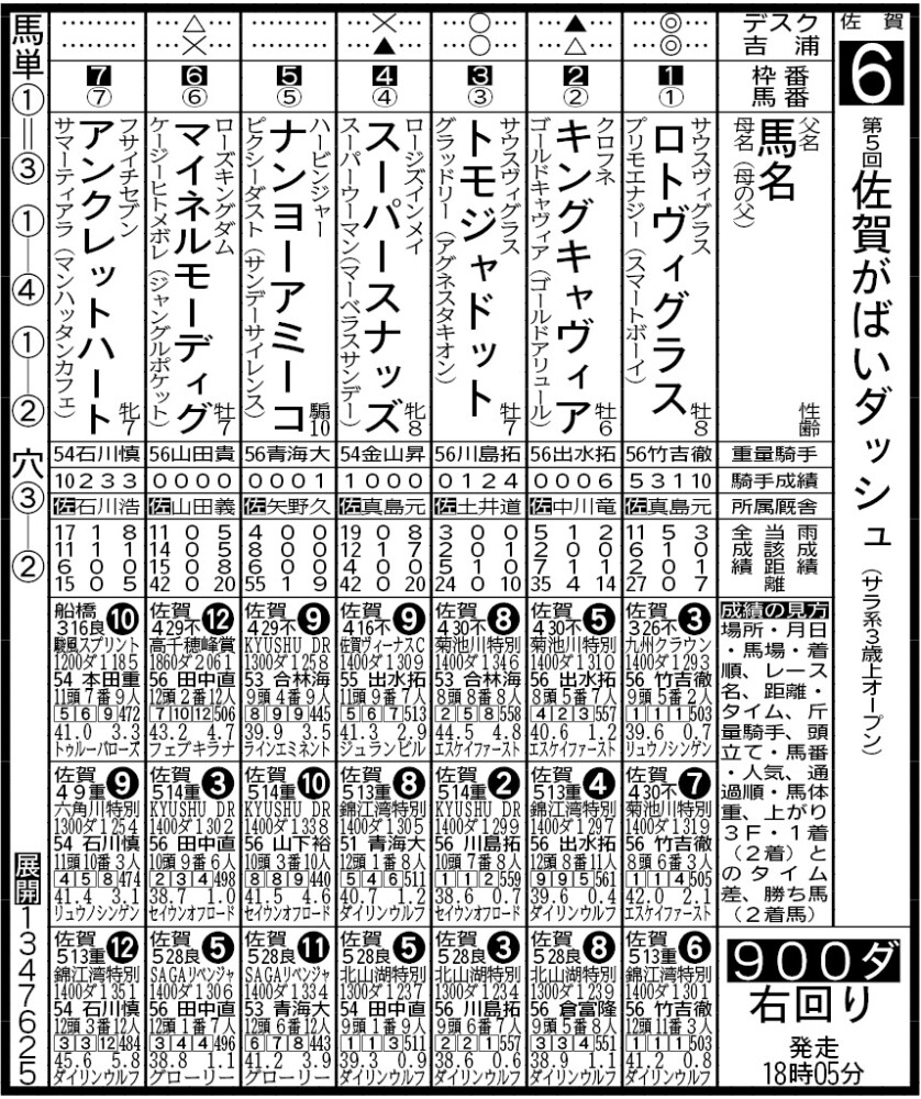 スーパースナッズは一時の勢いはないものの、地力が侮れない。佐賀スプリングダッシュはロトヴィグラスに食い下がって2着を確保。距離適性もあり、流れ込みを狙う。